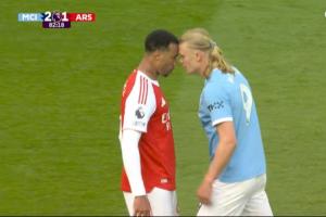 体育资讯04月20日讯 本轮英超焦点战曼城2-1战胜阿森纳,比赛第83分钟,哈兰德和加布里埃尔顶牛导致两队球员之间爆发了冲突,二人各吃一张黄牌。