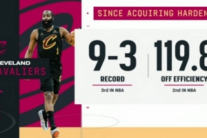 备注:哈登出战的比赛 骑士8胜1负